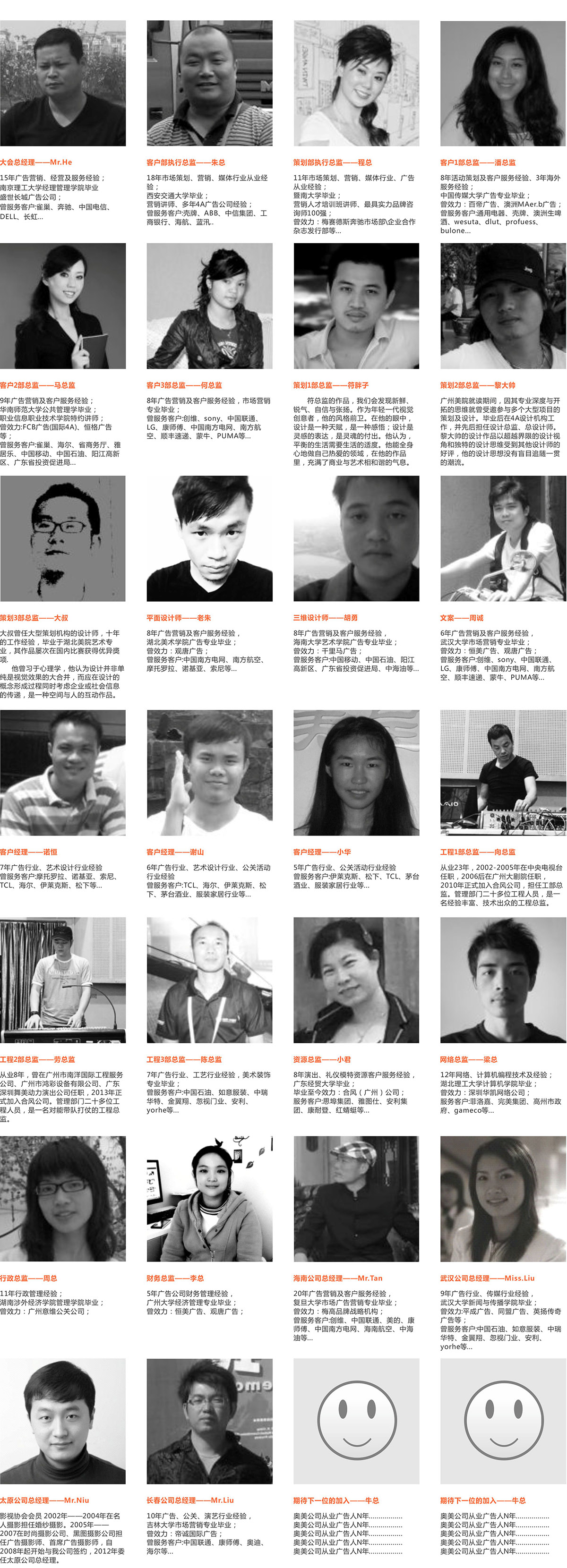 一個(gè)又一個(gè)案例的成功,一個(gè)又一個(gè)完美的作品,都離不開合風(fēng)公司每一位成員的智慧和汗水。值得自豪的是:我們擁有著一支能文能武、收發(fā)自如的作戰(zhàn)隊(duì)伍。卓有成效的創(chuàng)意策略、打動(dòng)人心的文案、完美震撼的執(zhí)行表現(xiàn)、認(rèn)真負(fù)責(zé)的客服人員,我們是一個(gè)整體。我們有能力深入的調(diào)查、合理的分析、精準(zhǔn)的創(chuàng)意、完善的策劃、 專業(yè)的實(shí)施。
