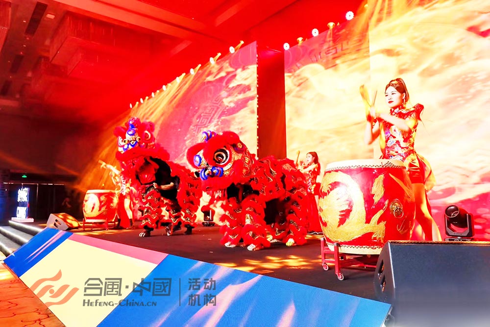「合風(fēng)演出」廣東廣州比較專業(yè)的演出經(jīng)紀(jì)表演節(jié)目演藝公司提供的禮儀慶典廣告?zhèn)髅焦P(guān)活動策劃創(chuàng)意節(jié)目《獅呈鼓舞》,本節(jié)目適合于晚會年會演出活動的開場節(jié)目,舞臺上激昂的中華龍鼓的擊鼓聲,配上舞獅表演助興,寓意著吉祥如意。