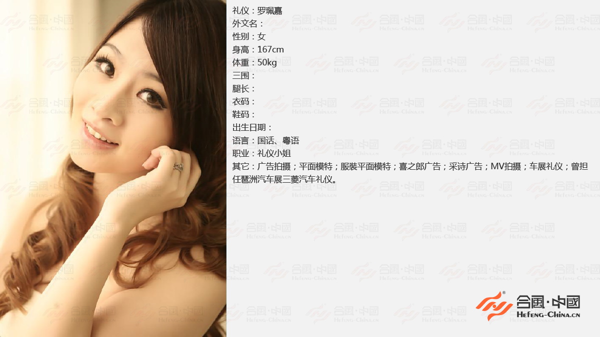 曾擔任:廣告拍攝,平面模特,服裝平面模特,喜之郎廣告,采詩廣告,MV拍攝,車展禮儀 曾擔任琶洲汽車展三菱汽車禮儀